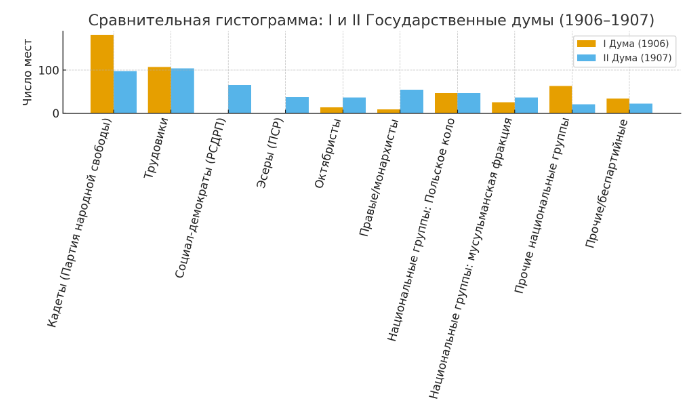 4. С помощью дополнительных источников информации (в том числе Интернета) соберите данные о политических партиях, прошедших в I и II Государственную думу. Проанализируйте, как изменился партийный состав II Государственной думы по сравнению с первым созывом. Ответ представьте в виде сравнительной гистограммы. Чем, по вашему мнению, можно объяснить данные изменения?