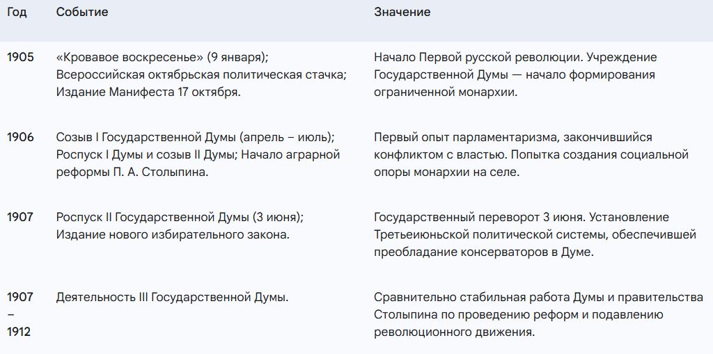 Добавить текст Вернуть оригиналИзменение избирательного закона (Третьеиюньский переворот), что обеспечило в Думе преобладание консервативных сил и дворянства.