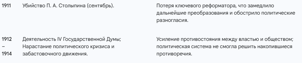 Необходимость реформирования российского общества в начале XX в. возникла из-за системного кризиса, который ярко проявился в ходе Первой русской революции (1905–1907 гг.). Основными причинами этой необходимости были: