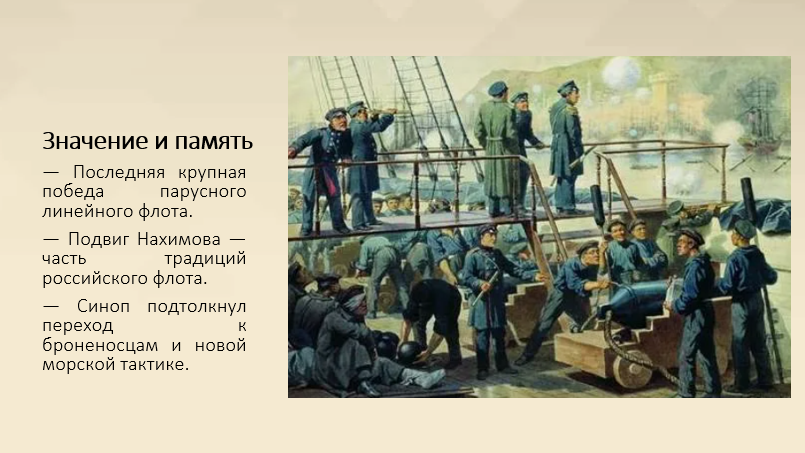 С военной точки зрения Синоп — последняя крупная победа парусного линейного флота. Опыт массированного применения разрывных снарядов показал уязвимость деревянных кораблей и ускорил переход ведущих флотов к паровым броненосцам и новой тактике. Память о подвиге Нахимова и моряков стала частью традиций российского флота.