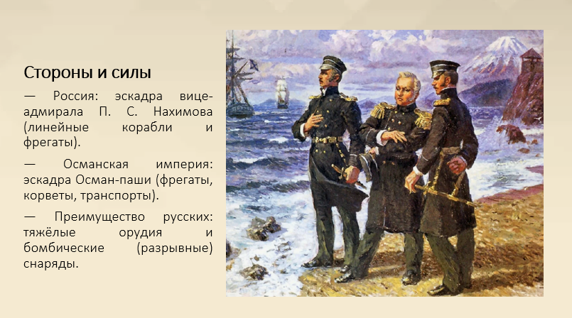 Русской эскадрой командовал вице-адмирал Павел Степанович Нахимов. В его распоряжении были линейные парусные корабли и фрегаты Чёрноморского флота. Главным техническим преимуществом русских стали бомбические — разрывные — снаряды по системе Пэксана, способные поджигать деревянные корпуса и склады боеприпасов.