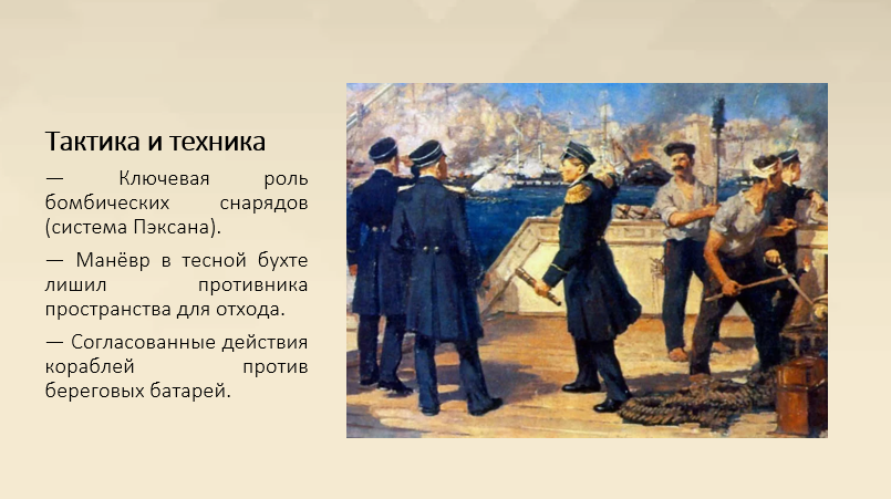 План Нахимова был дерзким: внезапно войти в тесную бухту строем, стать на якоря и сосредоточенным огнём подавить береговые батареи, затем сжечь и потопить турецкие корабли. Утром русская эскадра выполнила манёвр, и завязалась ожесточённая артиллерийская дуэль. Разрывные снаряды вызвали пожары на фрегатах противника и на складских береговых постройках; батареи были подавлены, часть турецких кораблей взорвалась.