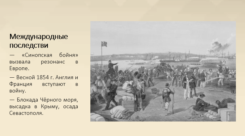 Однако политические последствия оказались противоположными. В Европе сражение получило название «Синопская бойня» и стало поводом для вмешательства великих держав. Уже весной 1854 года Великобритания и Франция вступили в войну на стороне Османской империи. Их паровые эскадры пришли в Чёрное море, началась морская блокада и высадка союзников в Крыму, что привело к осаде Севастополя.