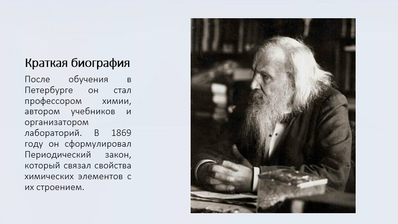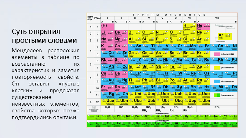 Периодический закон химических элементов Д. И. Менделеев 1869 Создал фундамент для развития химии, позволил систематизировать элементы и предсказывать свойства новых, еще не открытых элементов.