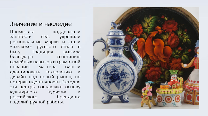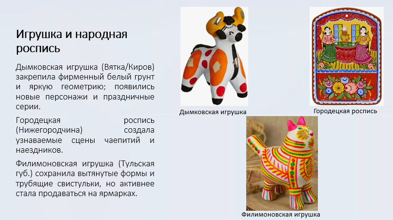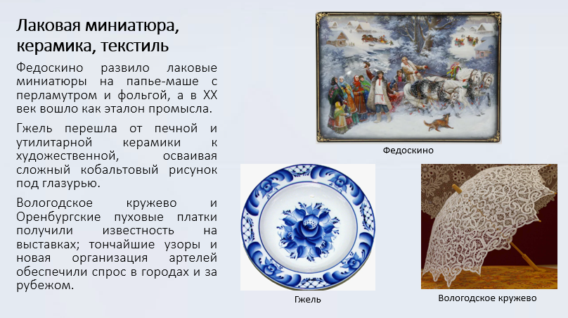 Добавить текст Вернуть оригинал8. Создайте электронную презентацию (не менее пяти слайдов) «Развитие народных художественных промыслов в России во второй половине XIX в.: традиции и новации». Выступите с ней перед одноклассниками.