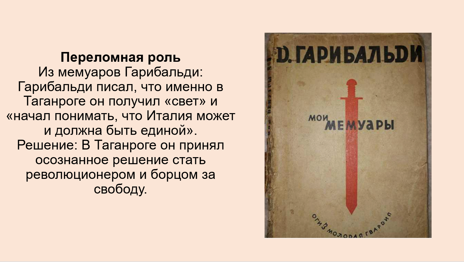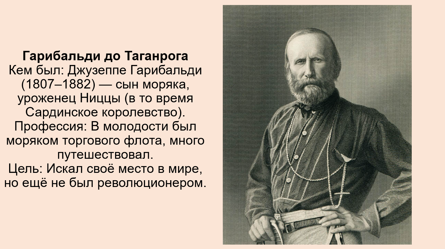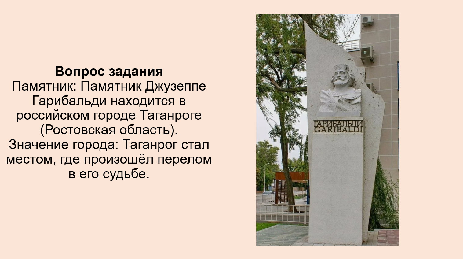 5. В одном из городов России есть памятник Дж. Гарибальди. Выясните, в каком городе он находится. Обратитесь к мемуарам Гарибальди и выясните, почему этот город сыграл переломную роль в его судьбе. Результат оформите в виде презентации. Обсудите ее с друзьями.