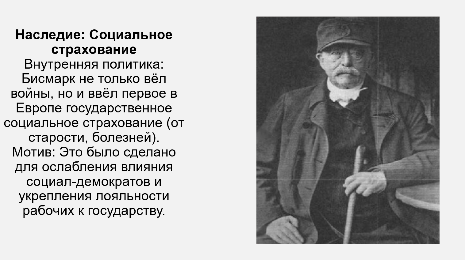 2. Социальное страхование: Одновременно с репрессиями Бисмарк ввёл первое в Европе государственное социальное страхование (от болезней, старости, несчастных случаев) с целью оторвать рабочих от влияния социал-демократов и укрепить их лояльность государству.