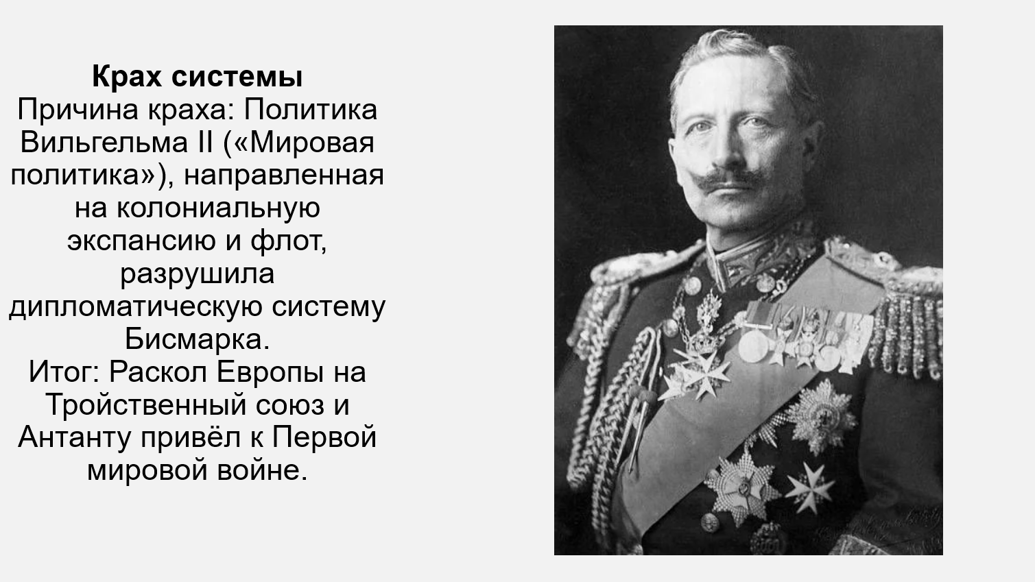 1. Политика «Мирового величия» Вильгельма II. После отставки Бисмарка, кайзер Вильгельм II перешёл к агрессивной «мировой политике» (Weltpolitik), направленной на захват колоний и строительство мощного военно-морского флота для конкуренции с Великобританией. Эта политика была по своей сути экспансионистской и милитаристской.