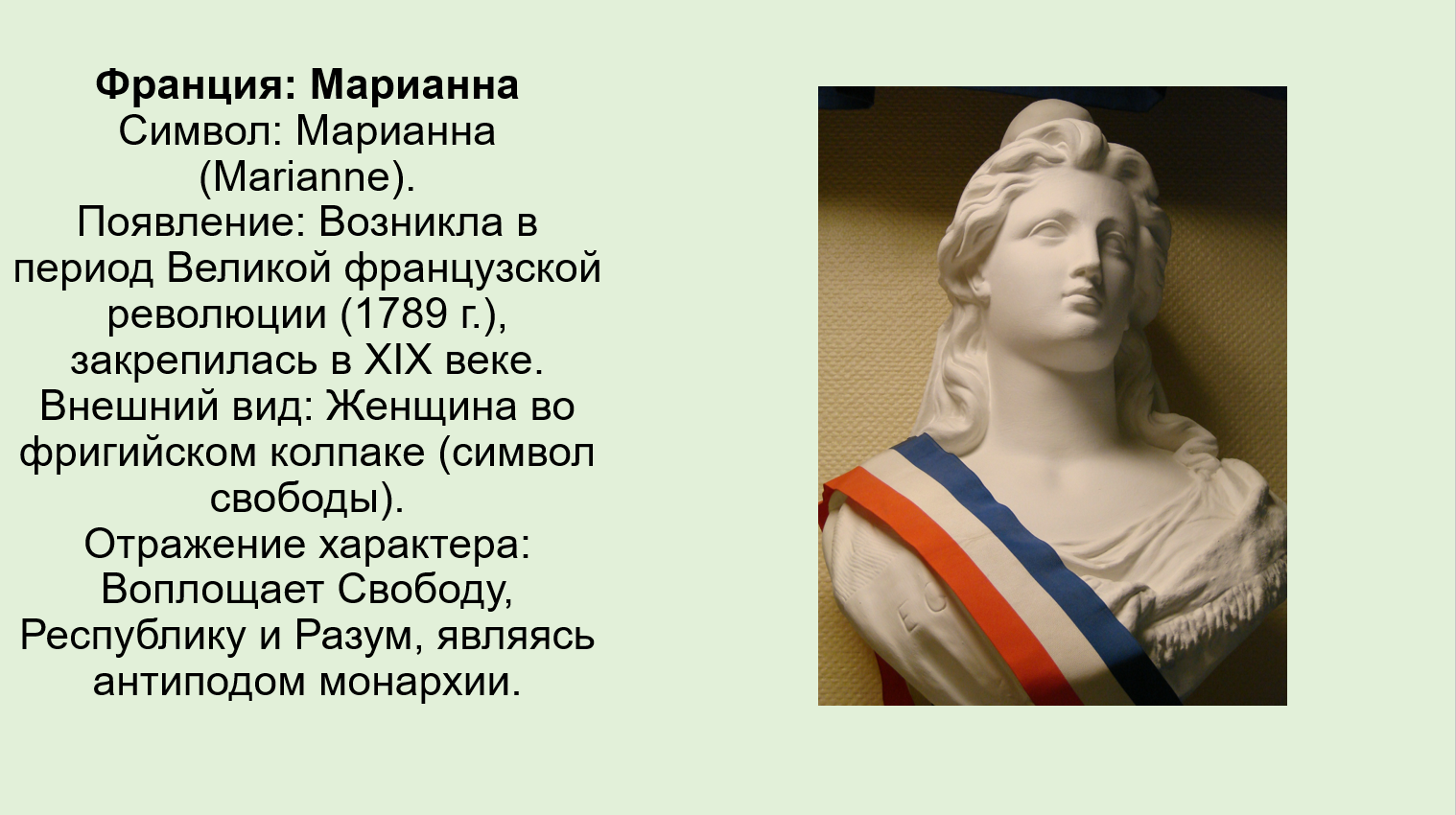 Добавить текст Вернуть оригиналНациональный характер: Воплощает Республику, Свободу, Разум и национальный дух (в противовес монархии).