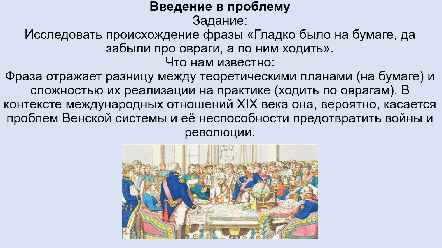 Перед участниками Венского конгресса стояли задачи территориального переустройства Европы после наполеоновских войн, восстановление дореволюционных порядков (легитимизм) и защита суверенитета (независимости) государств.