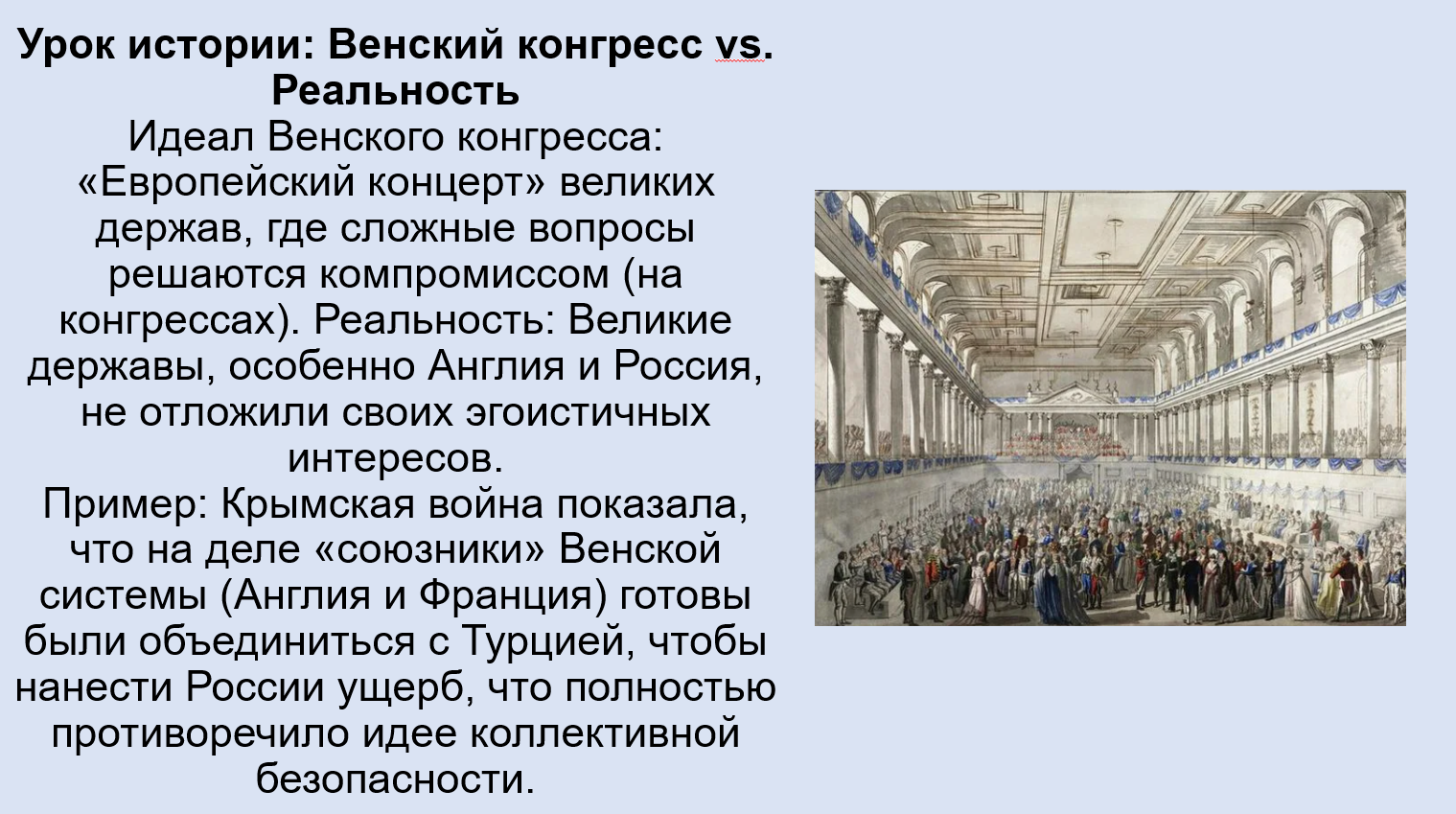 Добавить текст Вернуть оригиналНеспособность решить «Восточный вопрос». Неурегулированный спор о наследстве Османской империи постоянно обострял отношения. В результате противоречий, связанных с Балканами и проливами, произошла Крымская война, которая окончательно разрушила принцип коллективной безопасности и сотрудничества Венской системы.