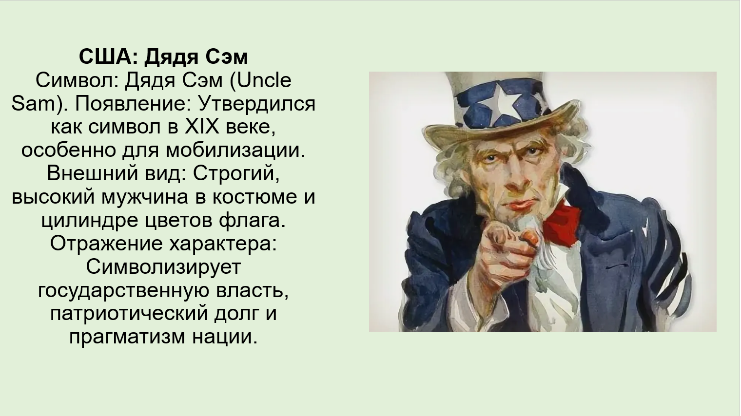 Добавить текст Озвучить Вернуть оригиналНациональный характер: Воплощает государственность, патриотический долг (использовался для призыва в армию), предпринимательскую хватку и прагматизм.