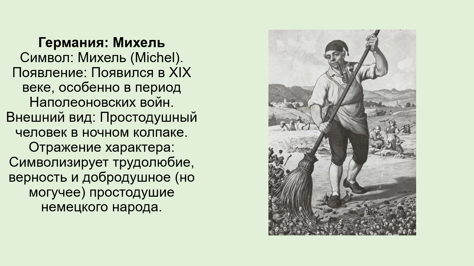 Добавить текст Озвучить Вернуть оригиналНациональный характер: Воплощает простодушие, трудолюбие и верность нации (после объединения Германии).