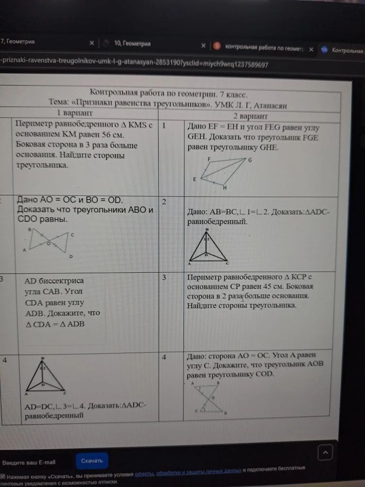 Ответ: Треугольник АВО равен треугольнику CDO по двум сторонам и углу между ними.
