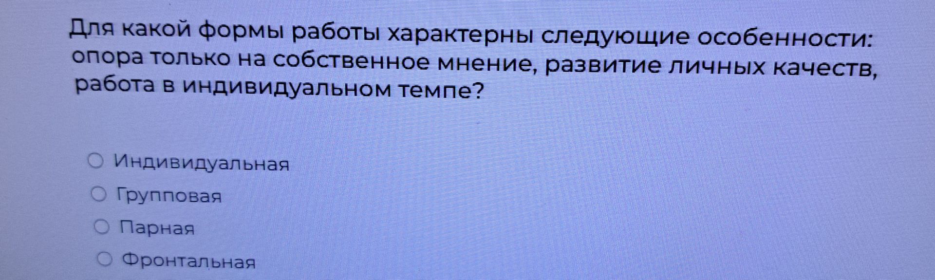 Для индивидуальной формы работы характерны следующие особенности: опора только на собственное мнение, развитие личных качеств, работа в индивидуальном темпе.