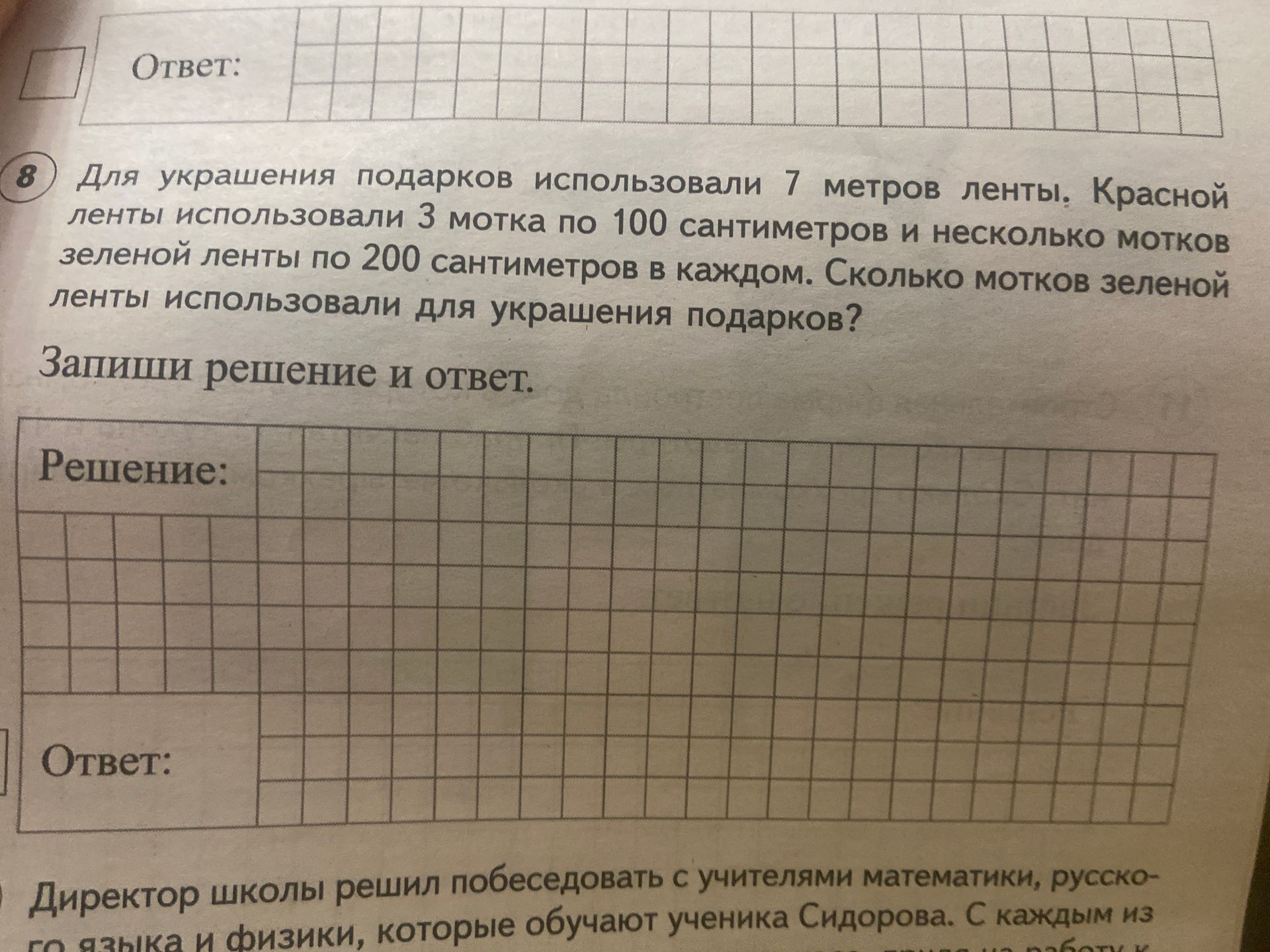 Ответ: 2 мотка зеленой ленты использовали для украшения подарков.