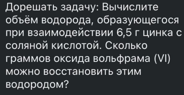 Ответ: 2,24 л водорода образуется при взаимодействии 6,5 г цинка с соляной кислотой. Этим водородом можно восстановить 7,72 г оксида вольфрама (VI).