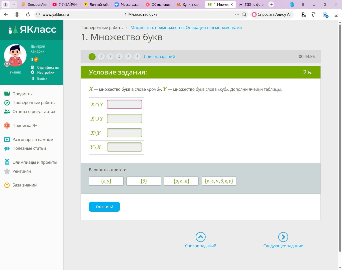 X - множество букв в слове «ромб» => {р, о, м, б}