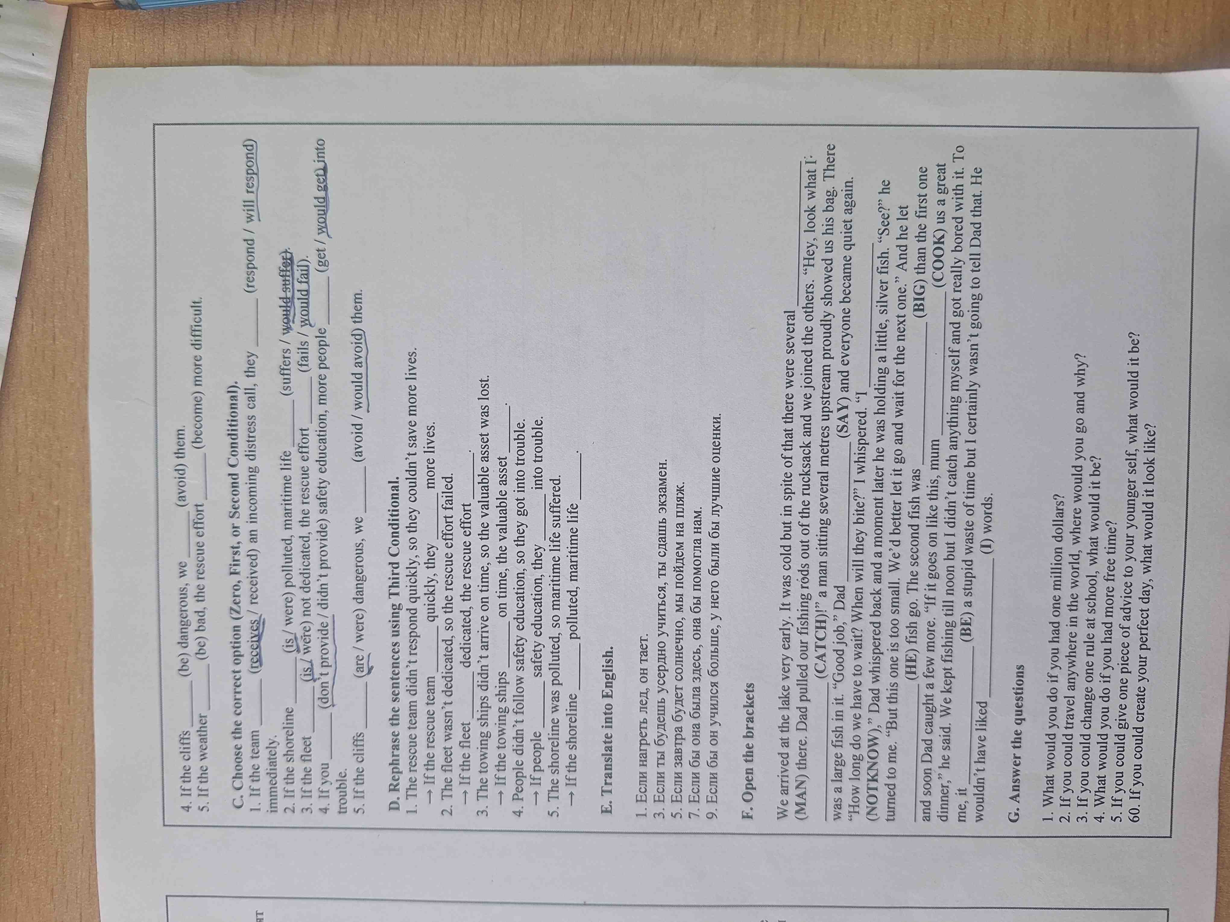 F. Open the brackets We arrived at the lake very early. It was cold but in spite of that there were several (MAN) there. Dad pulled our fishing rods out of the rucksack and we joined the others. "Hey, look what I (CATCH)!" a man sitting several metres upstream proudly showed us his bag. There was a large fish in it. "Good job," Dad (SAY) and everyone became quiet again. "How long do we have to wait? When will they bite?" I whispered. "I (NOTKNOW)," Dad whispered back and a moment later he was holding a little, silver fish. "See?" he turned to me. "But this one is too small. We'd better let it go and wait for the next one." And he let (HE) fish go. The second fish was (BIG) than the first one and soon Dad caught a few more. "If it goes on like this, mum (COOK) us a great dinner," he said. We kept fishing till noon but I didn't catch anything myself and got really bored with it. To me, it (BE) a stupid waste of time but I certainly wasn't going to tell Dad that. He (I) words. wouldn't have liked