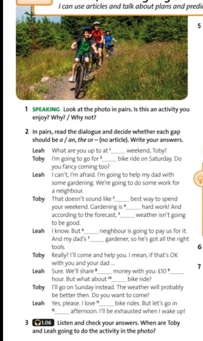 - Leah: Sure. We'll share ⁸ the money with you: £10 ⁹ an hour. But what about ¹⁰ a bike ride?