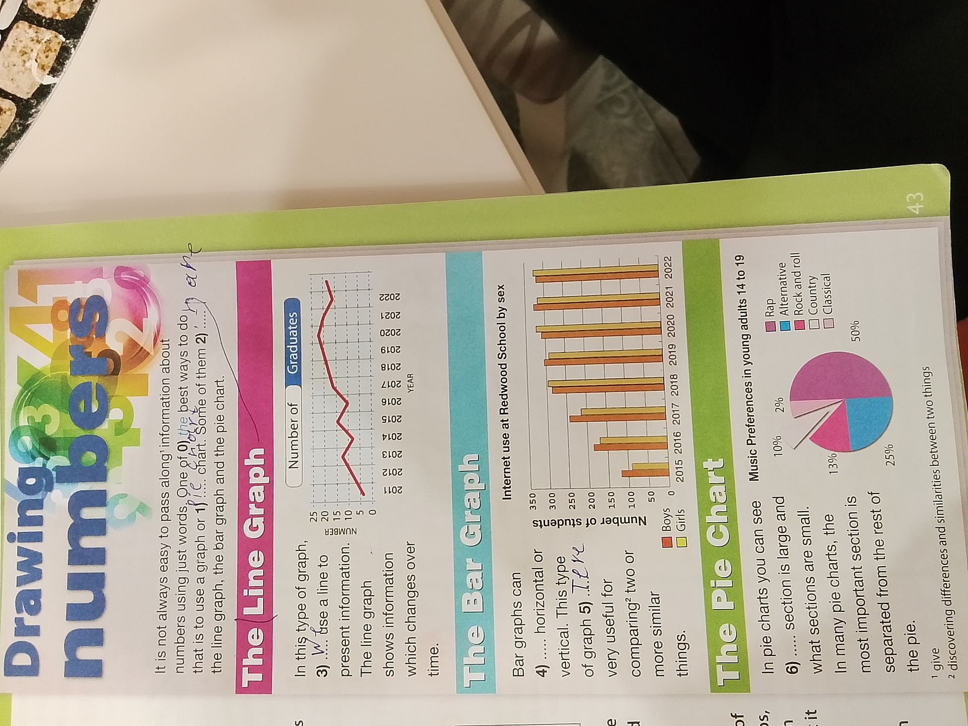 It is not always easy to pass along¹ information about numbers using just words. One of 0) the best ways to do that is to use a graph or 1. chart. Some of them 2) .... the line graph, the bar graph and the pie chart.