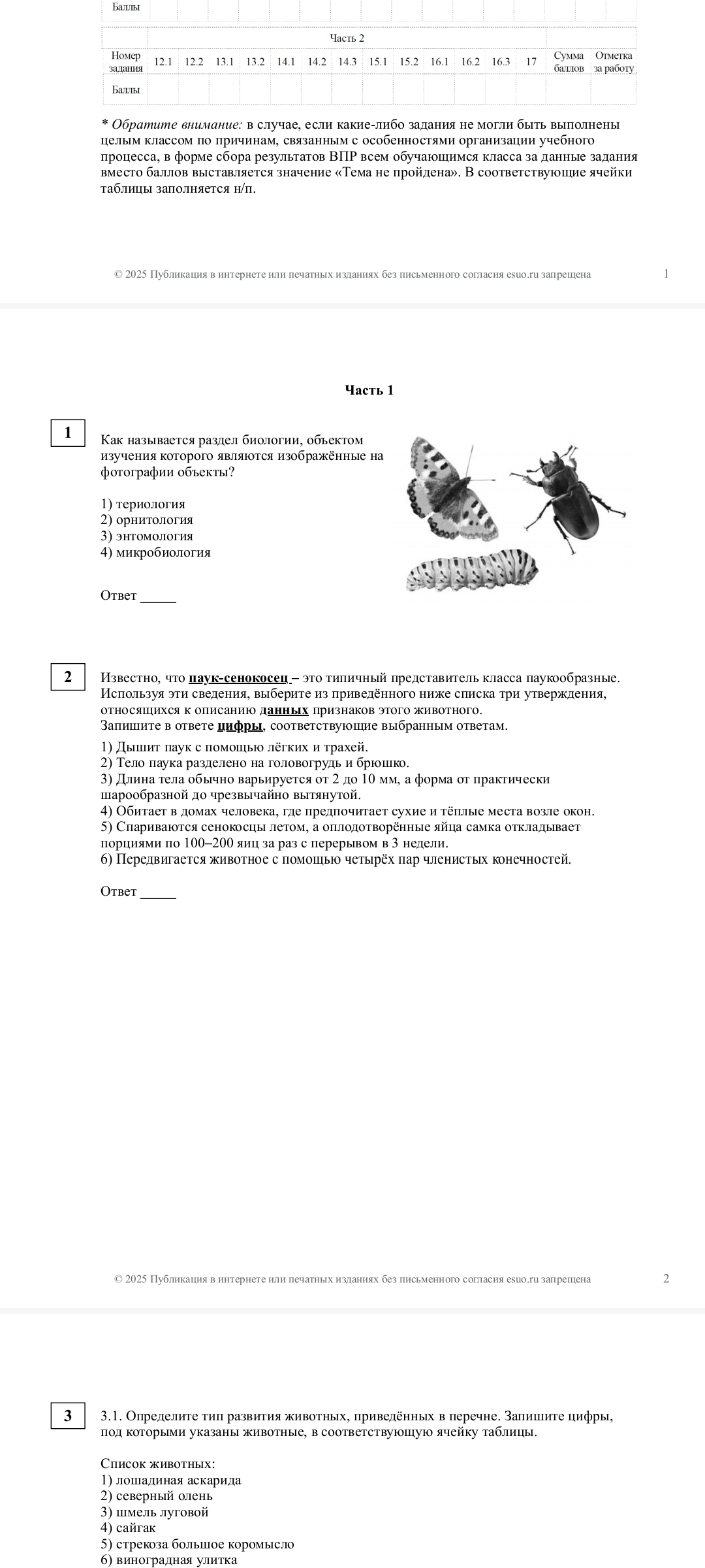 2. Известно, что паук-сенокосец - это типичный представитель класса паукообразные. Используя эти сведения, выберите из приведённого ниже списка три утверждения, относящихся к описанию данных признаков этого животного. Запишите в ответе цифры, соответствующие выбранным ответам.