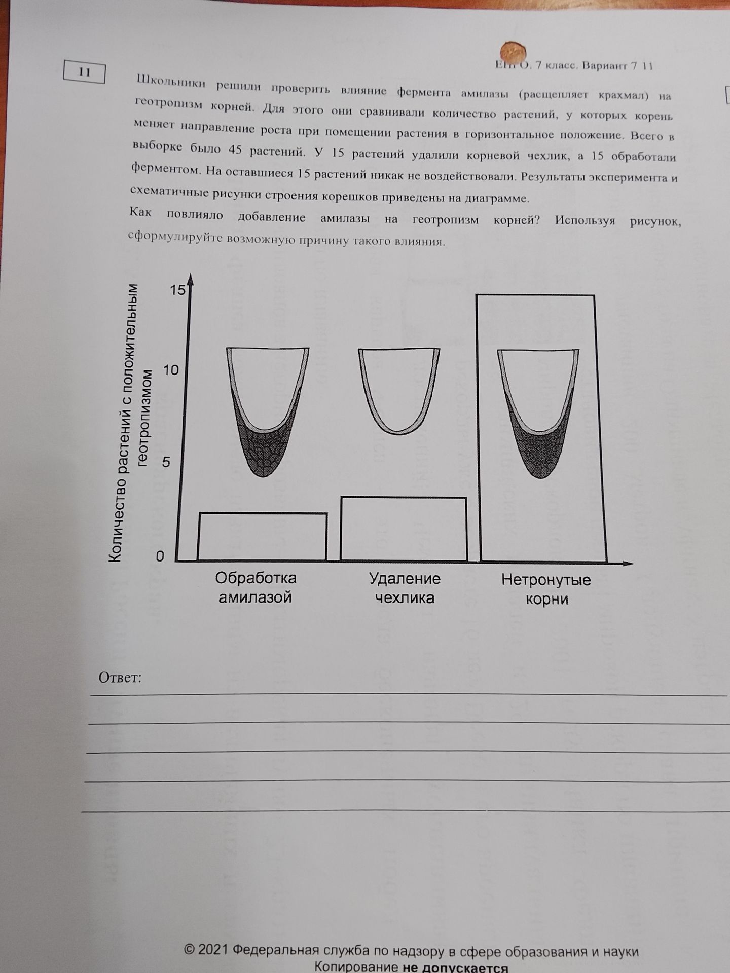 Ответ: Добавление амилазы подавляет геотропизм корней, возможно, из-за нарушения процесса гравитационного восприятия в корневом чехлике, вызванного расщеплением крахмала.