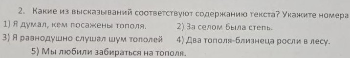 В зависимости от контекста текста, соответствующие высказывания могут быть разными. Если текст о природе и детских воспоминаниях, то, скорее всего, подойдут все высказывания, кроме, возможно, 4-го, так как в основном тополя растут не в лесу, а, например, вдоль дороги или около села. Однако, если в тексте больше внимания уделяется описанию местности вокруг села, то 2-е высказывание будет более уместным.