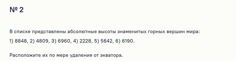 Расположим горы в порядке удаления от экватора. К сожалению, точное местоположение этих гор не указано, и невозможно определить их точную удаленность от экватора без дополнительной информации. Однако, основываясь на общих географических знаниях и высотах, можно предположить, что чем выше гора, тем дальше она от экватора, если все остальные факторы равны.