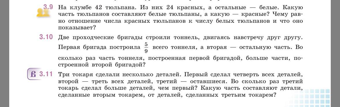 Ответ: белые тюльпаны составляют $$ \frac{3}{7} $$, красные тюльпаны составляют $$ \frac{4}{7} $$. Отношение красных к белым равно $$ \frac{4}{3} $$, то есть красных тюльпанов в $$ \frac{4}{3} $$ раза больше, чем белых.