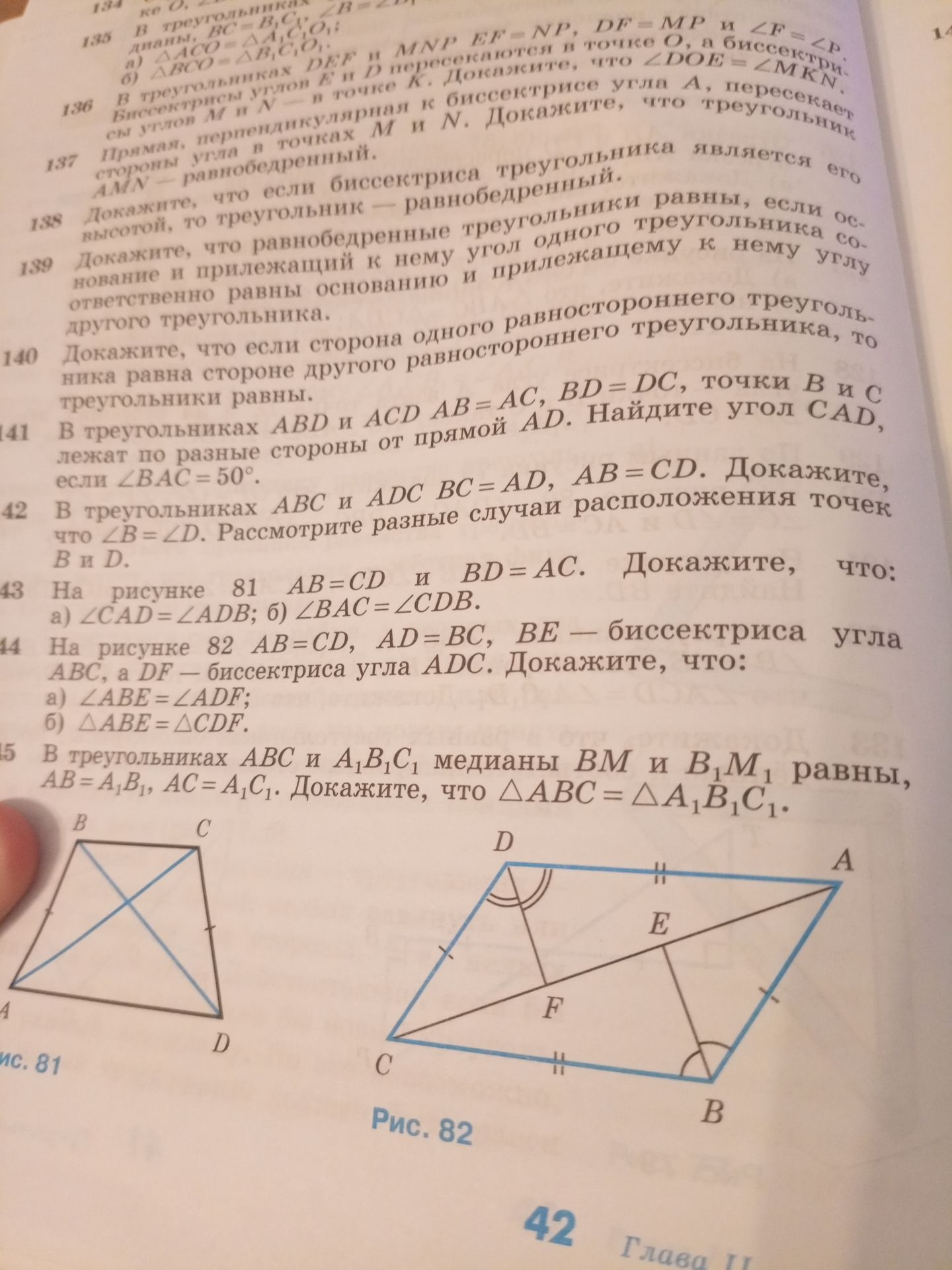 а) Рассмотрим треугольники ABD и DCA. У них АВ = CD, BD = AС по условию, AD - общая сторона. Следовательно, треугольники ABD и DCA равны по трем сторонам (III признак равенства треугольников). Из равенства треугольников следует равенство соответствующих углов: ∠ADB = ∠CAD.