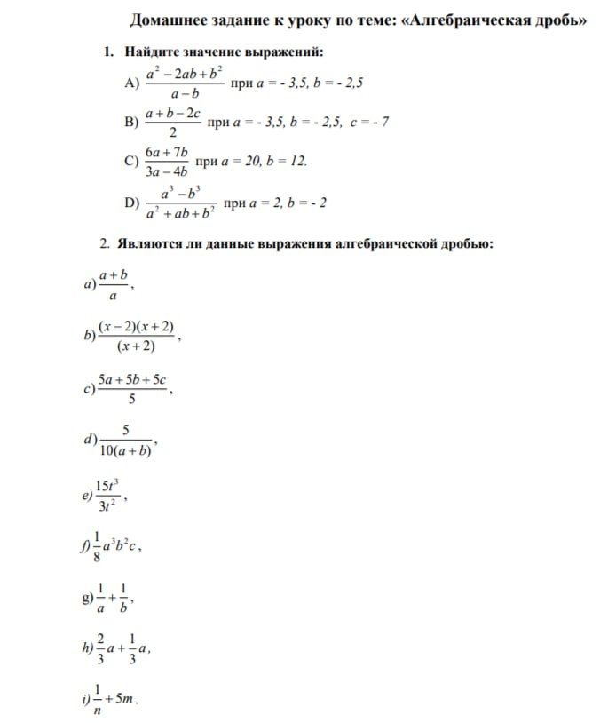 A) Подставим значения a = -3,5 и b = -2,5 в выражение $$\frac{a^2-2ab+b^2}{a-b}$$.