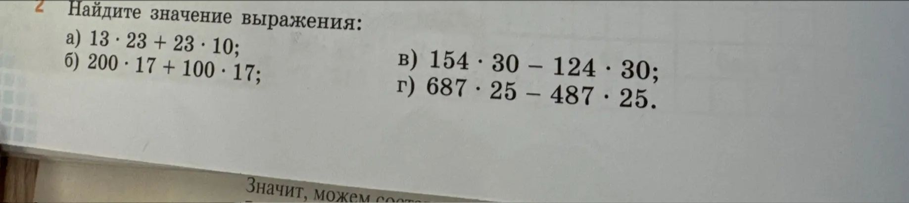 Решим данные примеры, используя распределительное свойство умножения относительно сложения и вычитания: $$a \cdot c + b \cdot c = c \cdot (a+b)$$, $$a \cdot c - b \cdot c = c \cdot (a-b)$$.