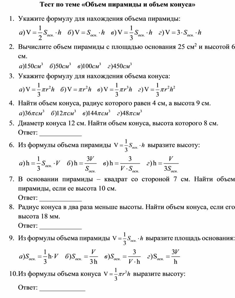 10. Из формулы объема конуса \(V = \frac{1}{3} \pi r^2 h\) выразите высоту: Ответ: ______