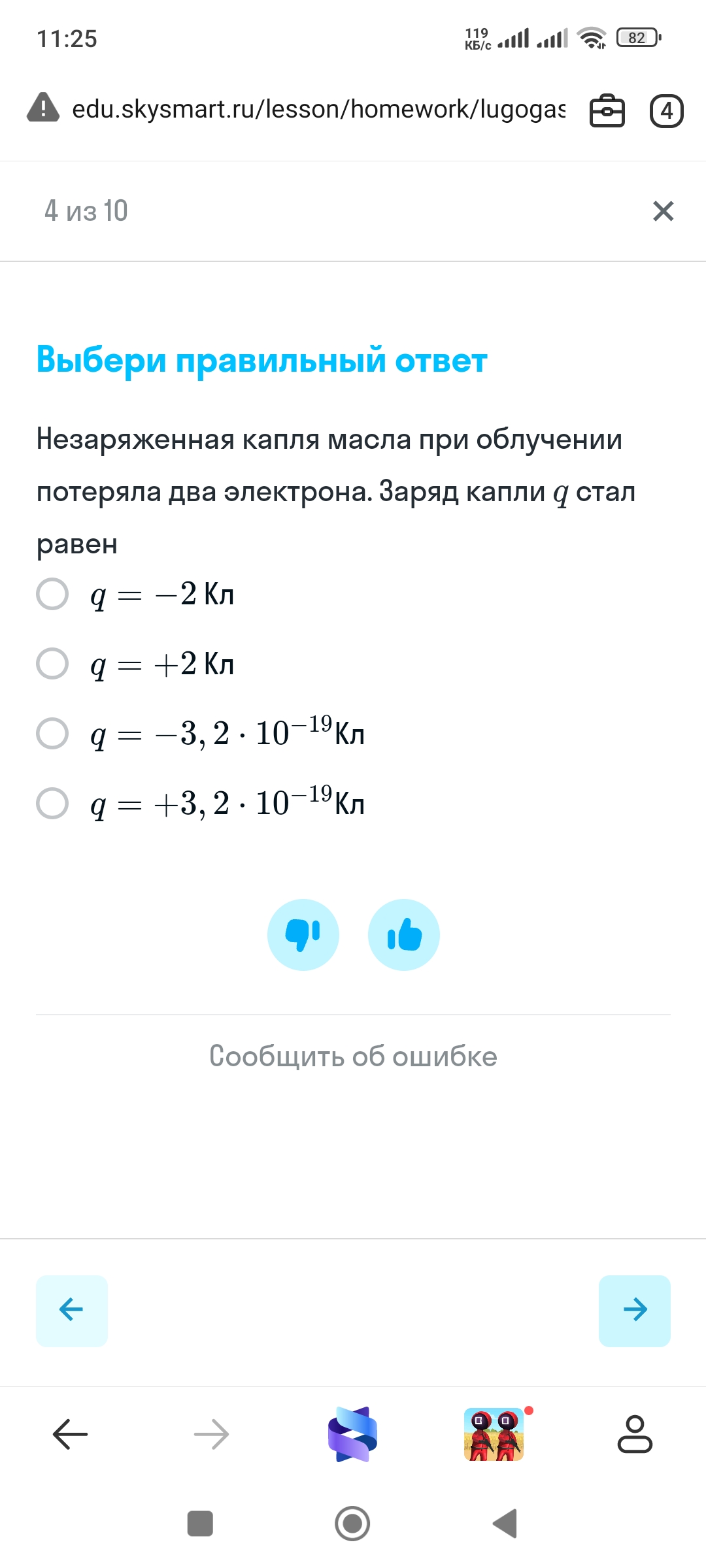 Заряд электрона равен \(-1.6 \cdot 10^{-19}\) Кл. Если капля теряет два электрона, то её заряд увеличивается на \(2 \cdot 1.6 \cdot 10^{-19}\) Кл. Ответ: \(+3.2 \cdot 10^{-19}\) Кл.