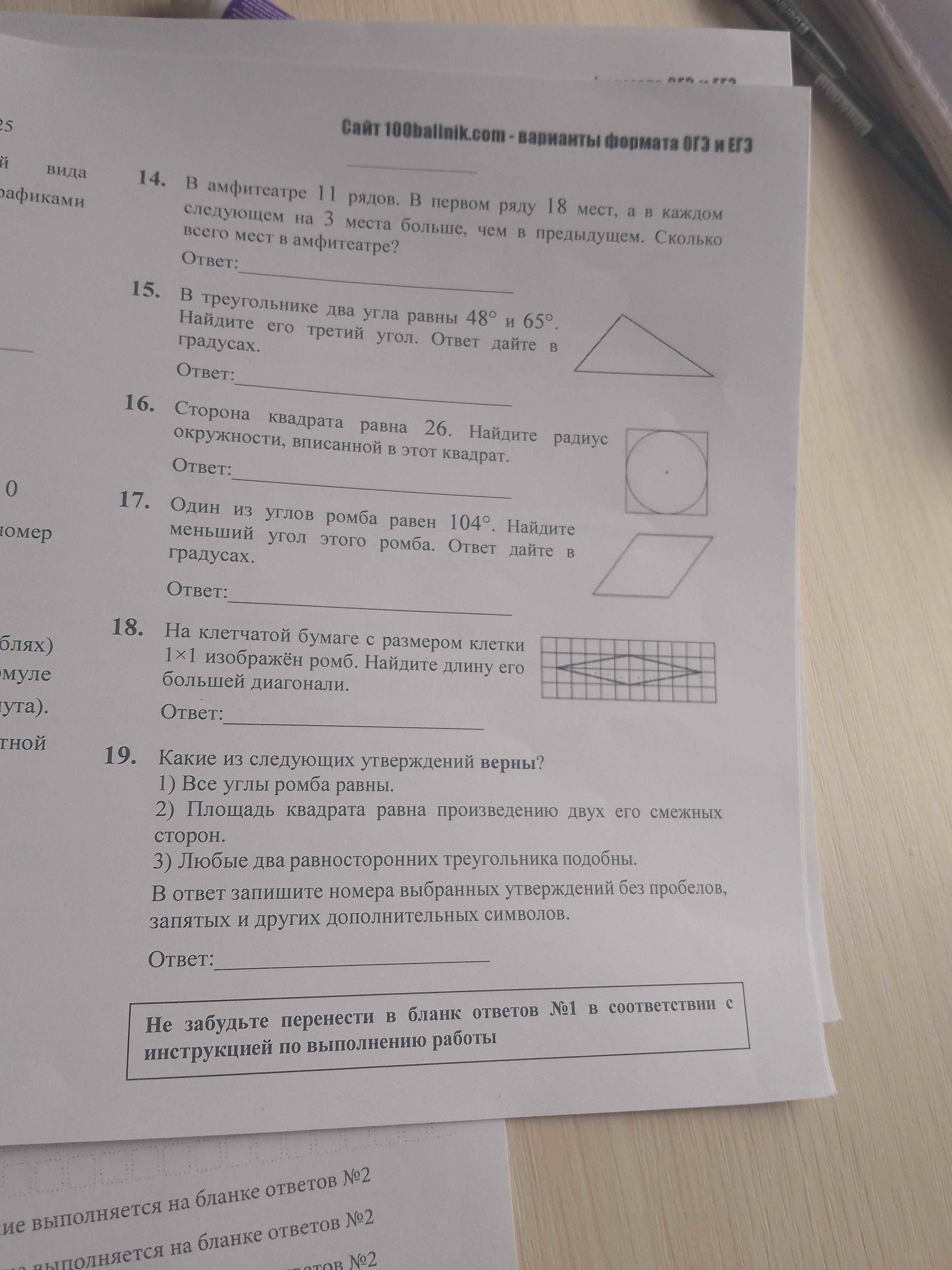 19. Какие из следующих утверждений верны? 1) Все углы ромба равны. 2) Площадь квадрата равна произведению двух его смежных сторон. 3) Любые два равносторонних треугольника подобны. В ответ запишите номера выбранных утверждений без пробелов, запятых и других дополнительных символов.