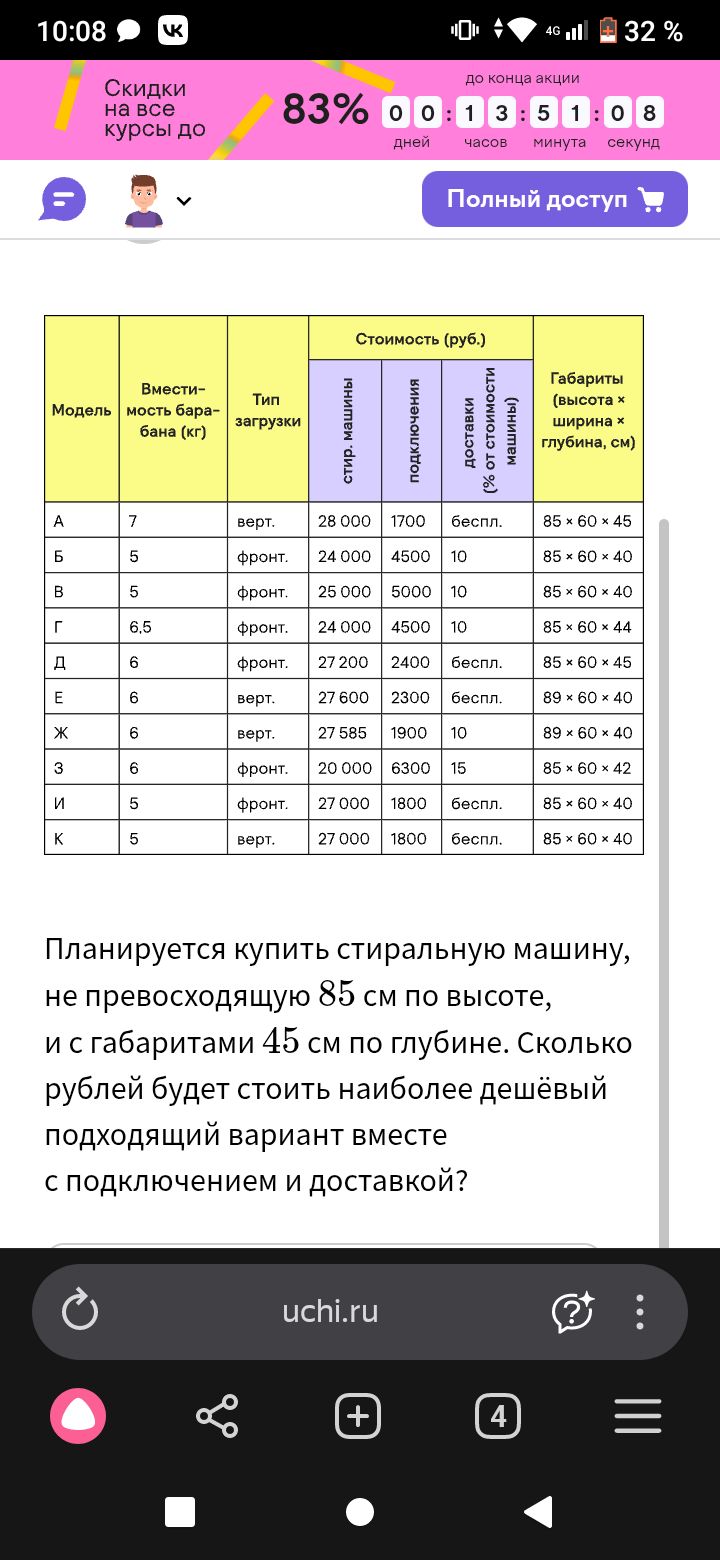 Для ответа на вопрос необходимо проанализировать таблицу и выбрать стиральную машину, подходящую по высоте (не более 85 см) и глубине (45 см). После этого нужно выбрать самую дешевую модель с учетом стоимости подключения и доставки.