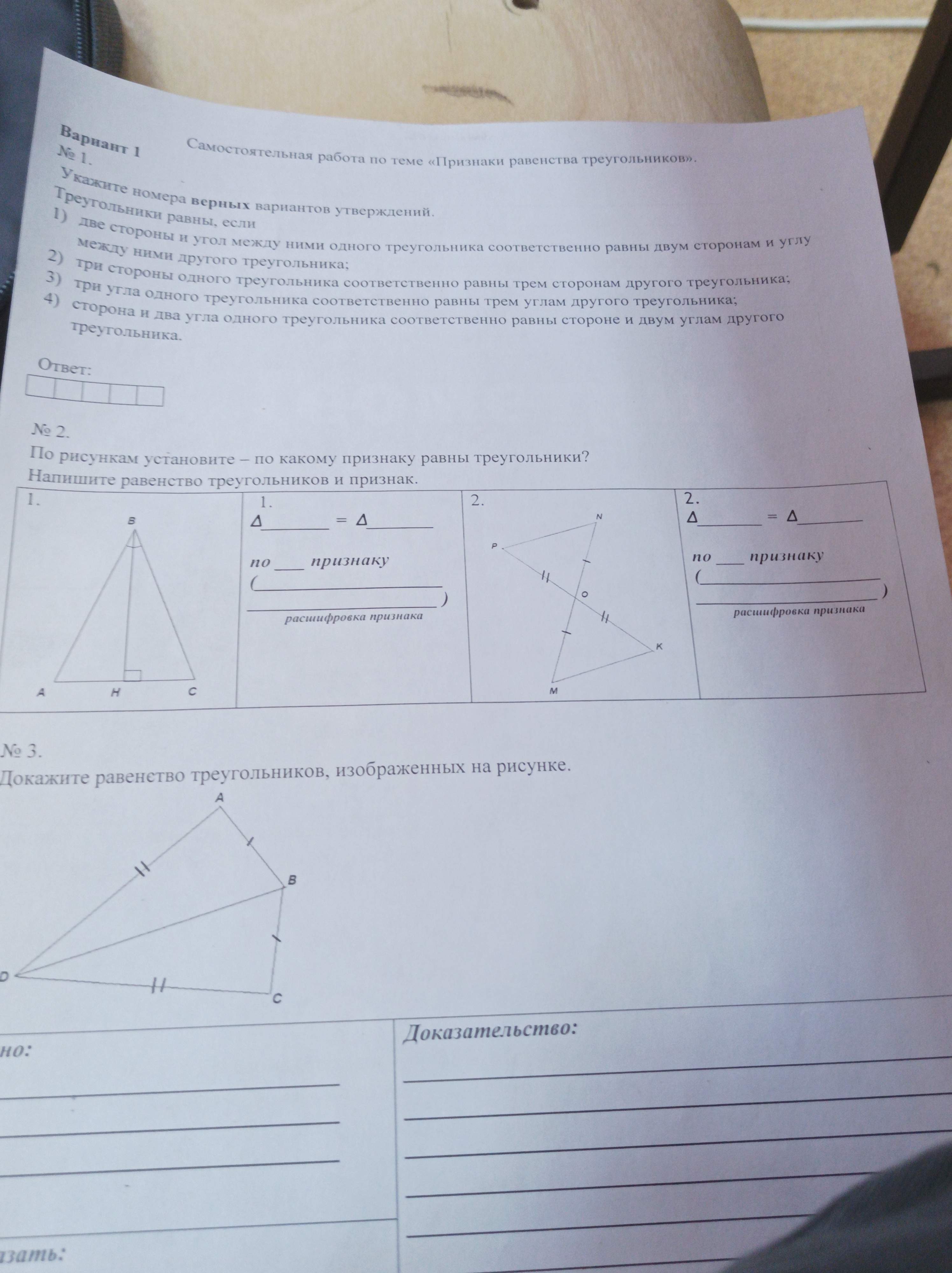 Тип задания: определение равенства треугольников по рисунку и указание признака.