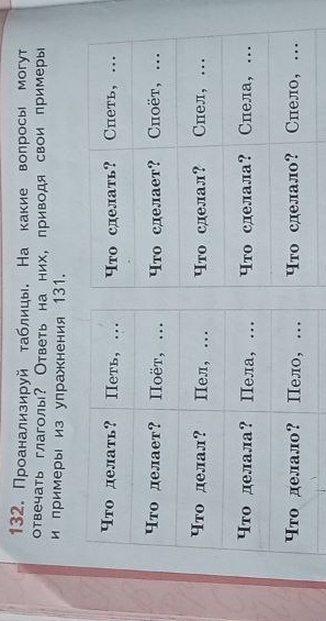 Проанализируй таблицы. На какие вопросы могут отвечать глаголы? Ответь на них, приводя свои примеры и примеры из упражнения 131.