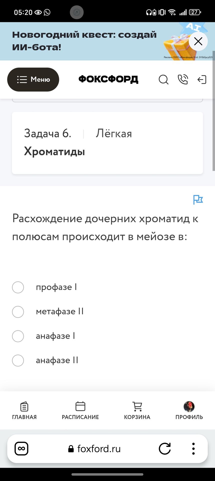 Расхождение дочерних хроматид к полюсам происходит в мейозе в: профазе І метафазе ІІ анафазе І анафазе ІІ