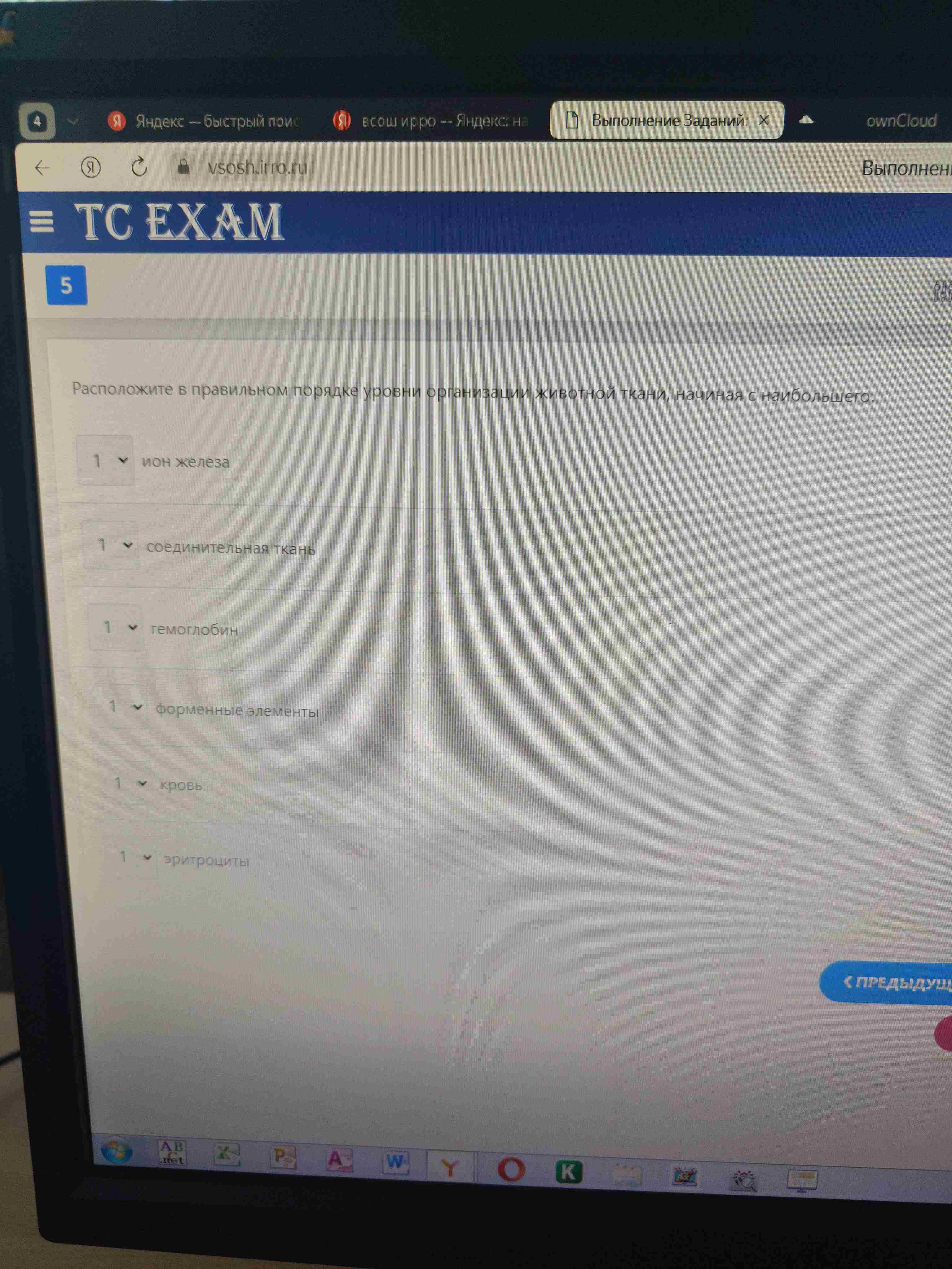 Привет, ученик! Чтобы правильно расположить уровни организации животной ткани, нам нужно понимать иерархию: от большего к меньшему. Соединительная ткань – это самый общий уровень, кровь является её разновидностью. Кровь состоит из форменных элементов (клеток), таких как эритроциты. Внутри эритроцитов находится гемоглобин, а гемоглобин содержит ионы железа. Поэтому, расставляя уровни от большего к меньшему, мы получим указанный выше порядок.