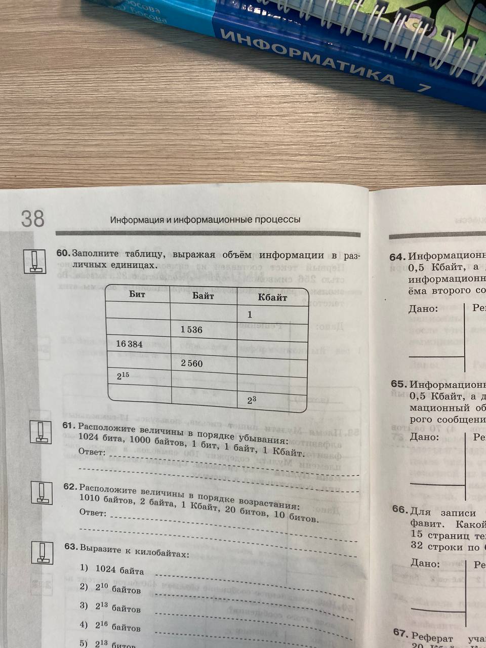 Выразите в килобайтах: 1024 байта, 2^10 байт, 2^16 байт, 2^20 байт, 2^13 байт.