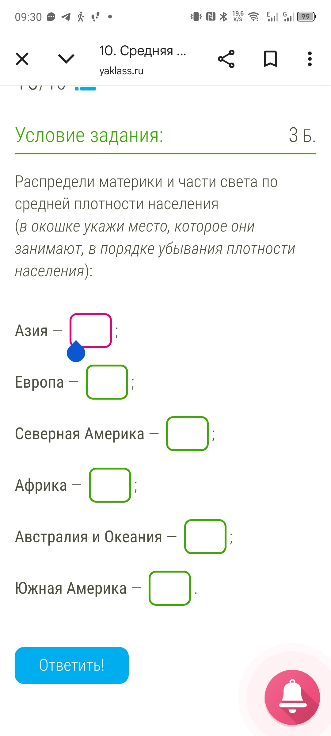 Распредели материки и части света по средней плотности населения (в окошке укажи место, которое они занимают, в порядке убывания плотности населения):