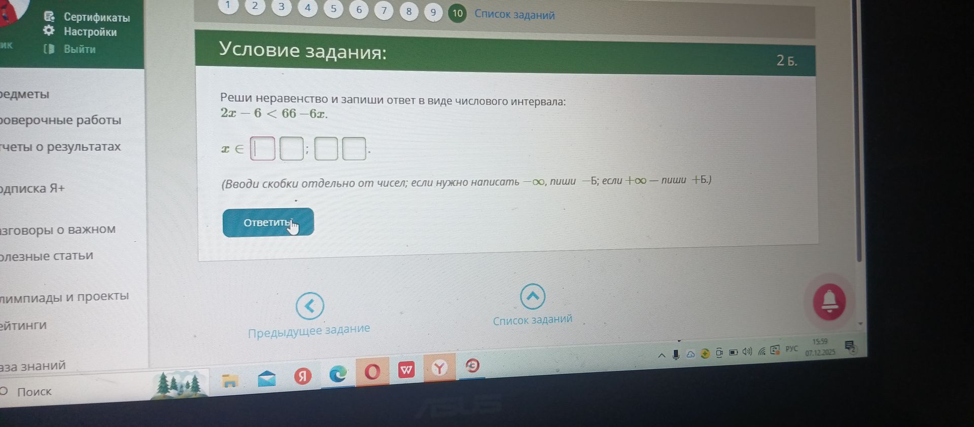 Решением неравенства является интервал от минус бесконечности до 9. В виде числового интервала это записывается так: $$(-\infty; 9)$$.