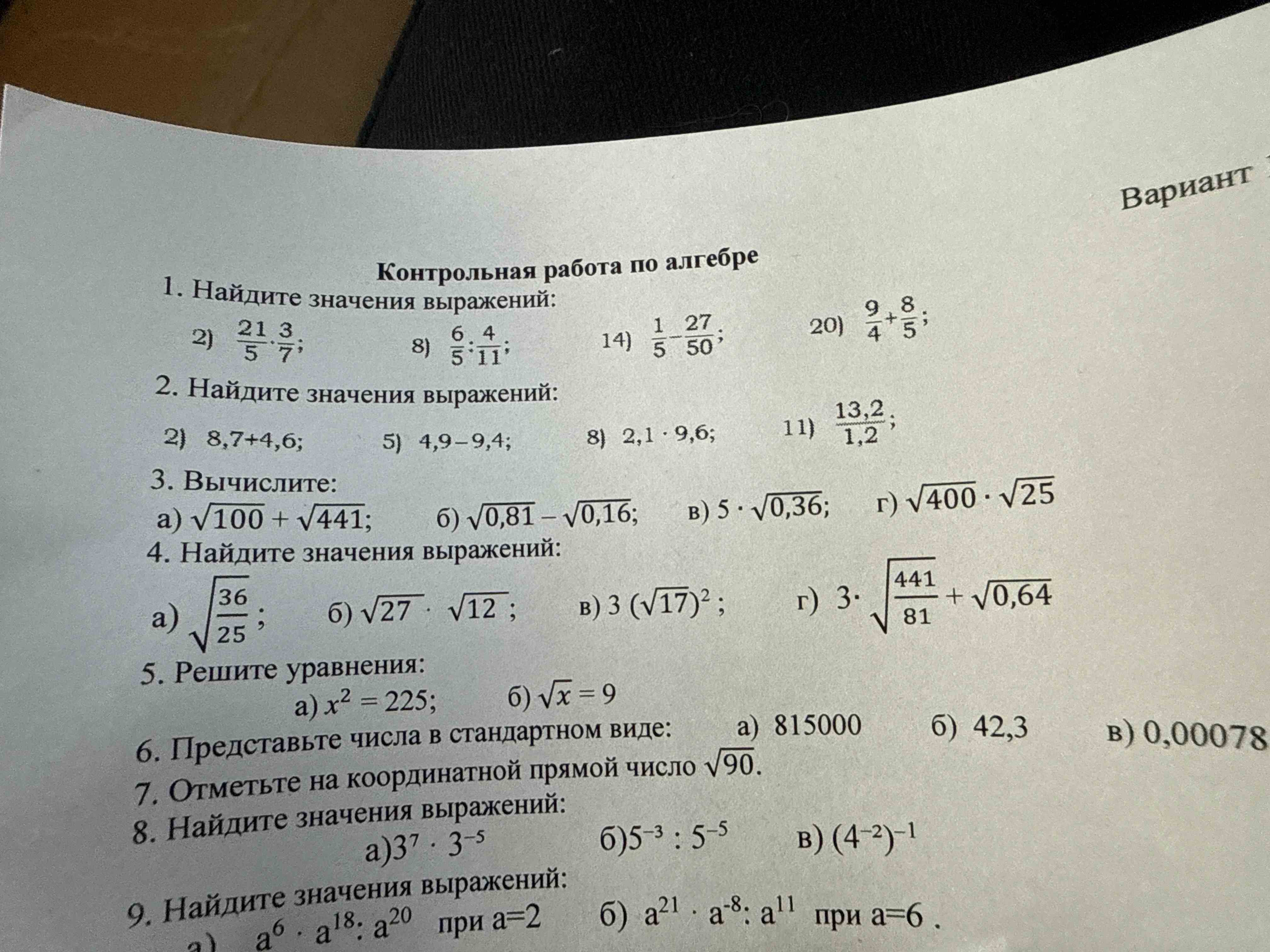 г) 3 \(\cdot \) \(\sqrt{\frac{441}{81}} + \sqrt{0,64}\)