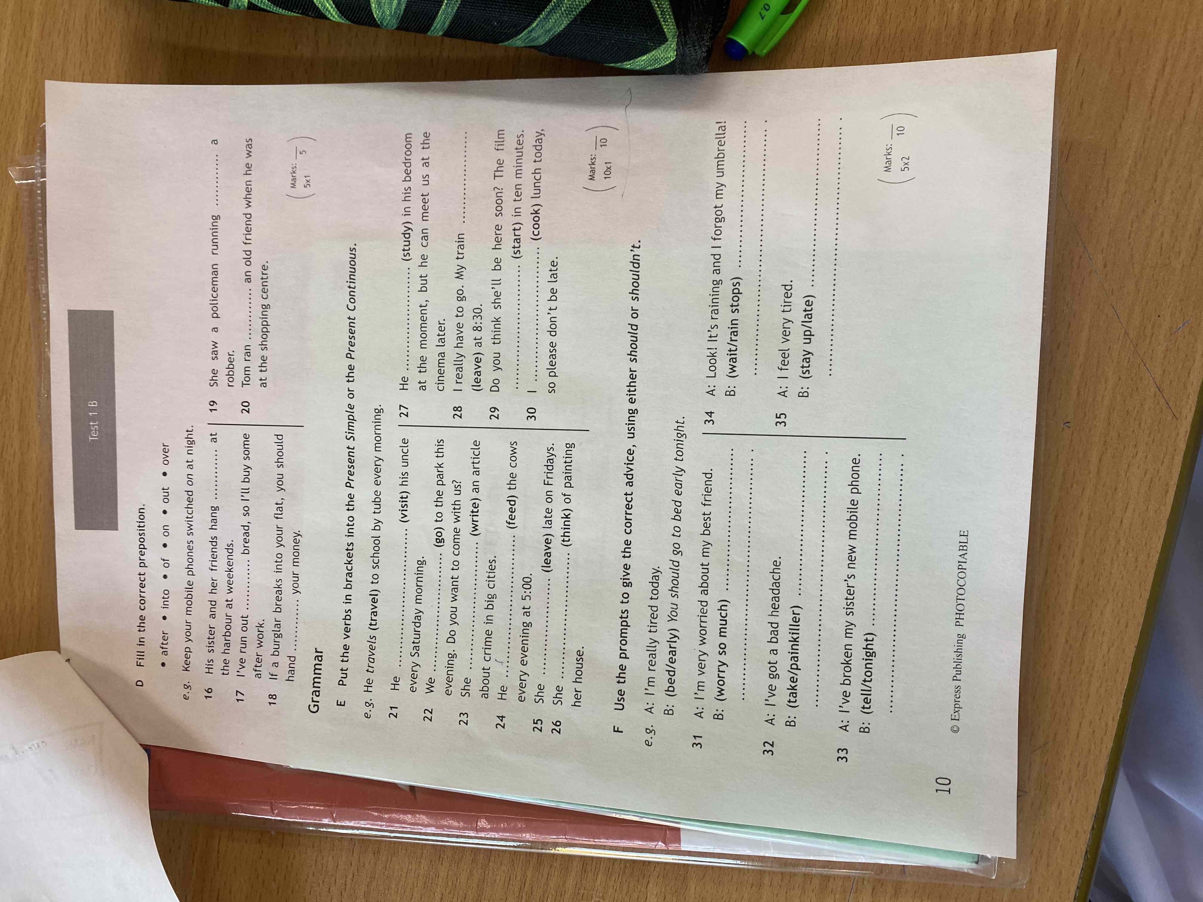 D Fill in the correct preposition. e.g. Keep your mobile phones switched on at night. 16 His sister and her friends hang ______ the harbour at weekends. 17 I've run _____ bread, so I'll buy some after work. 18 If a burglar breaks into your flat, you should hand ______ your money.