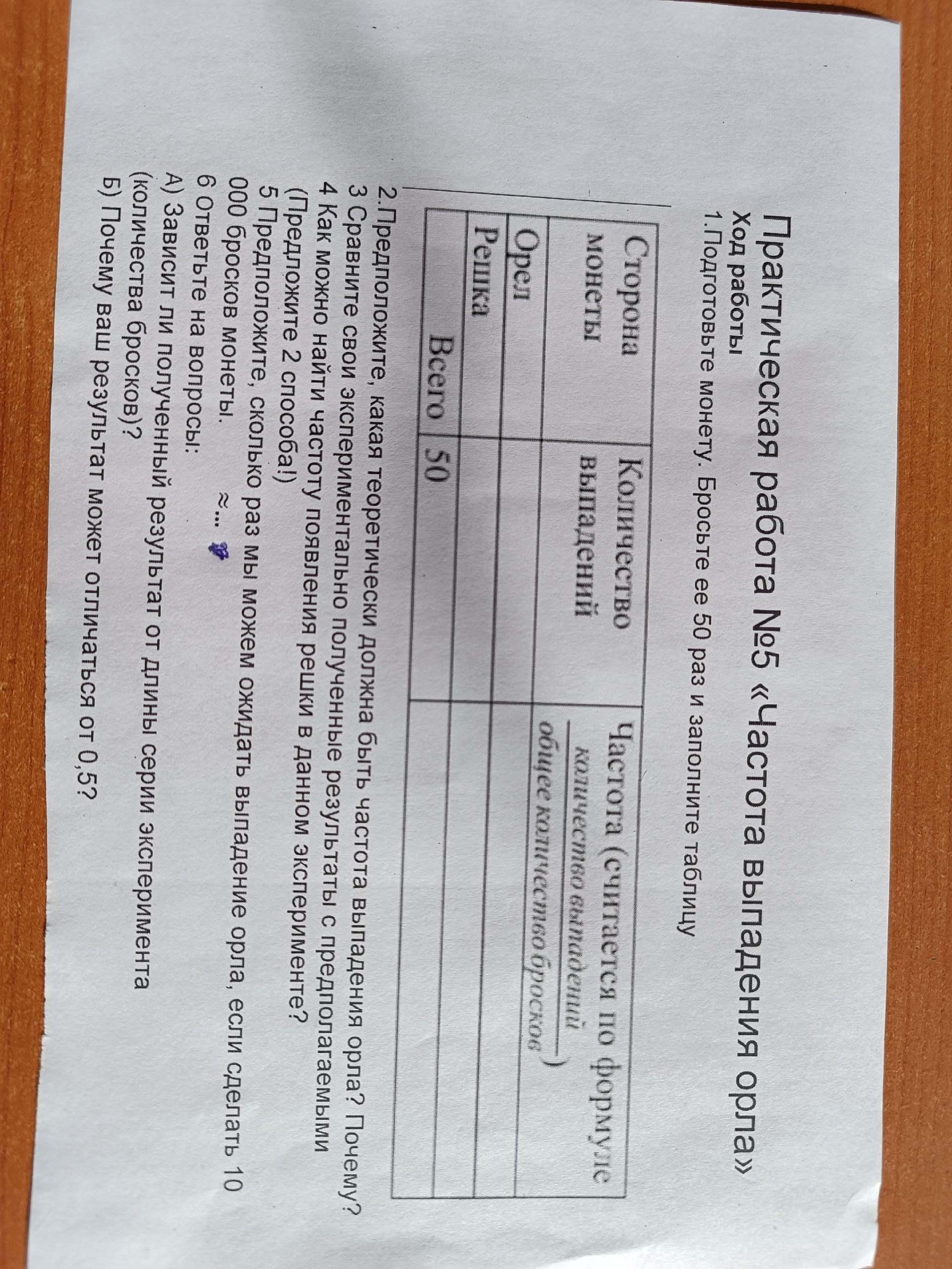 В моём примере экспериментальная частота выпадения орла составила 0.54, а решки 0.46. Это близко к теоретической вероятности 0.5, но не идеально совпадает. Небольшие отклонения в эксперименте – это нормально, особенно при небольшом количестве бросков.