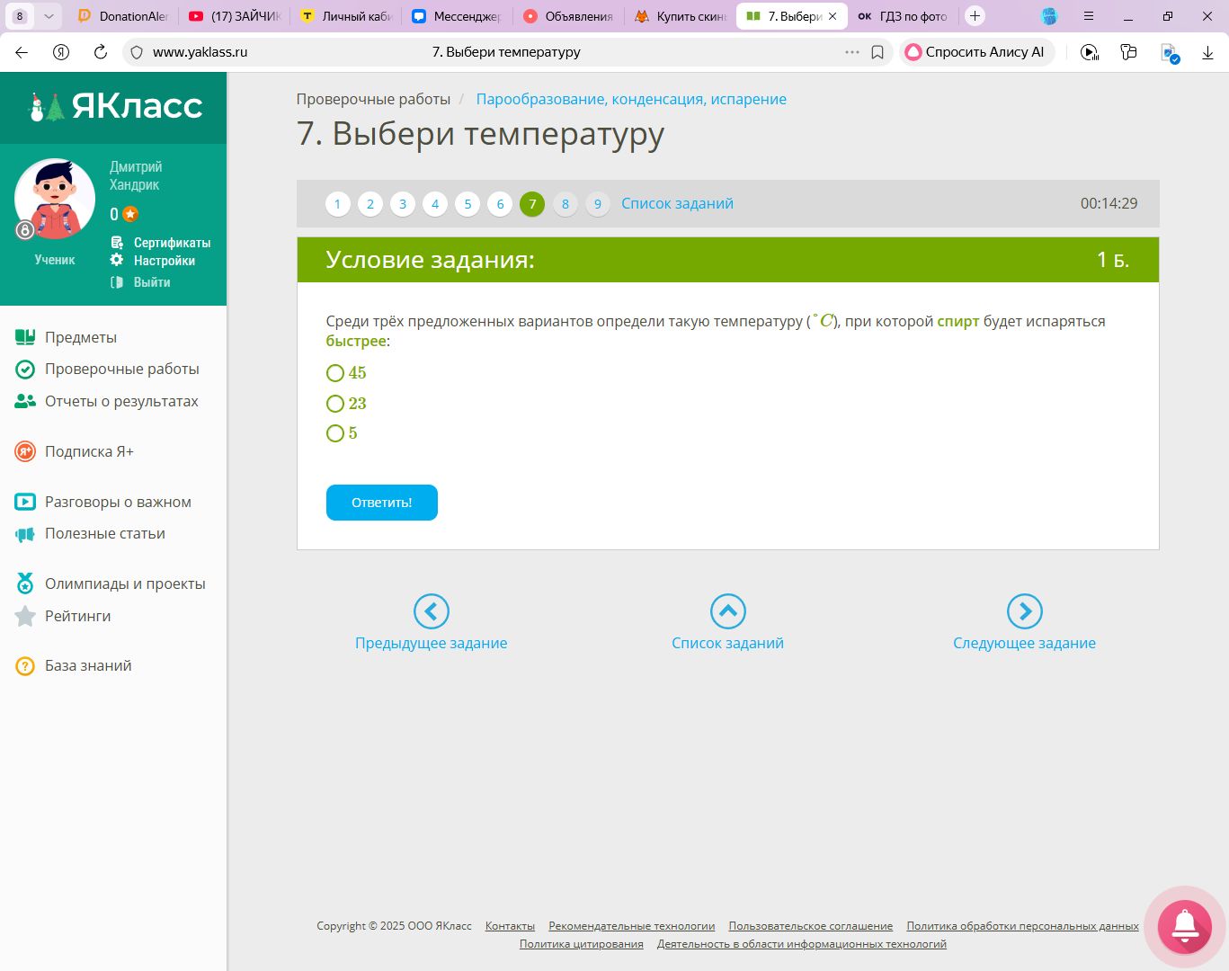 Чем выше температура, тем быстрее идёт процесс испарения жидкости. Из предложенных вариантов наибольшая температура 45 °С.