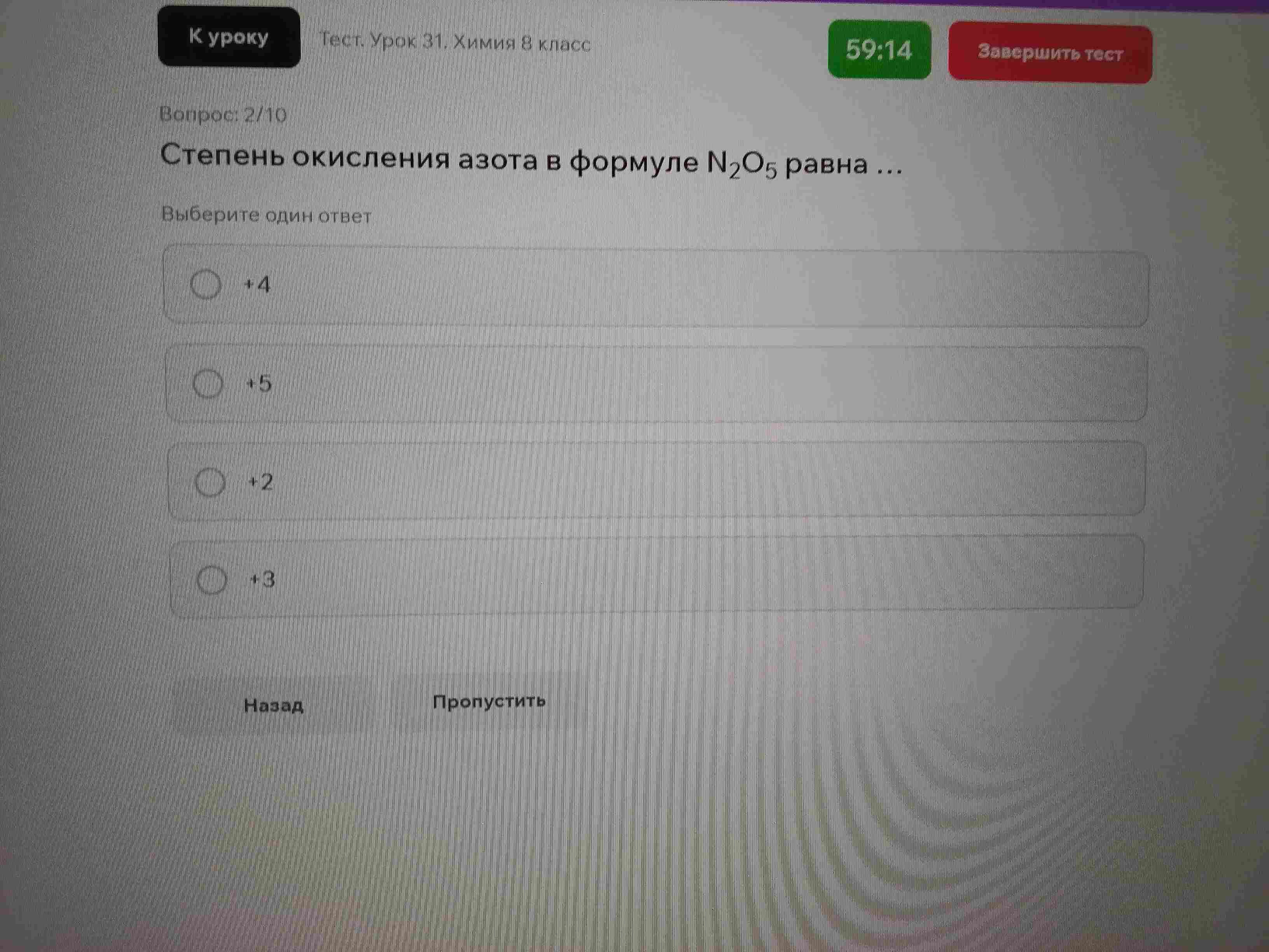 Следовательно, степень окисления азота в (N_2O_5) равна +5.