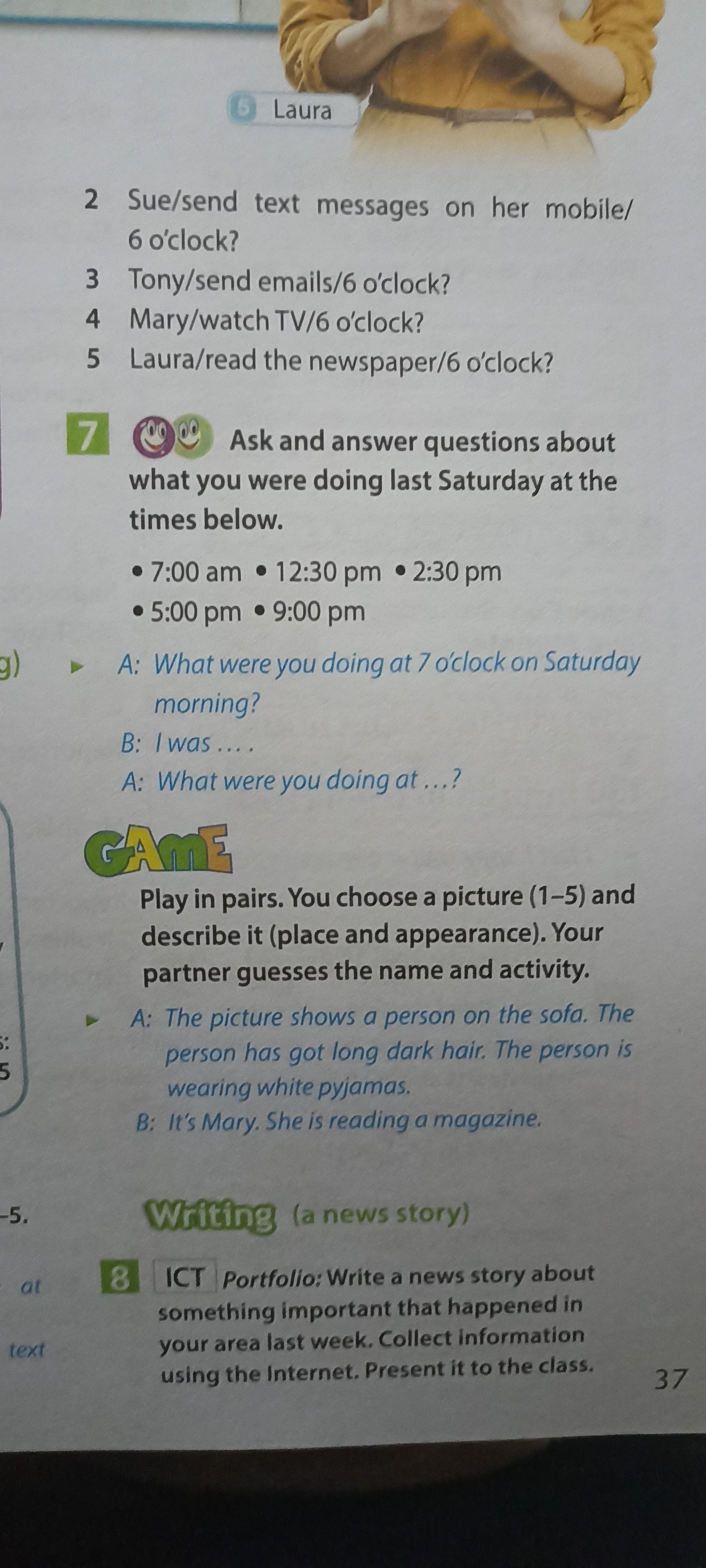 Ask and answer questions about what you were doing last Saturday at the times below. * 7:00 am * 12:30 pm * 2:30 pm * 5:00 pm * 9:00 pm